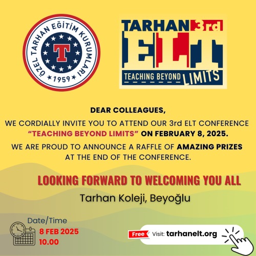 Sizleri 8 Şubat 2025’te gerçekleştireceğimiz “SINIRLARIN ÖTESİNDE ÖĞRETİM” konulu 3. ELT Konferansımıza içtenlikle davet ediyoruz.